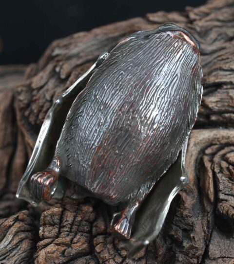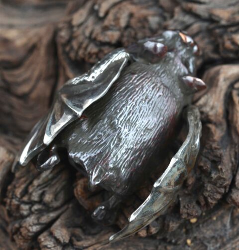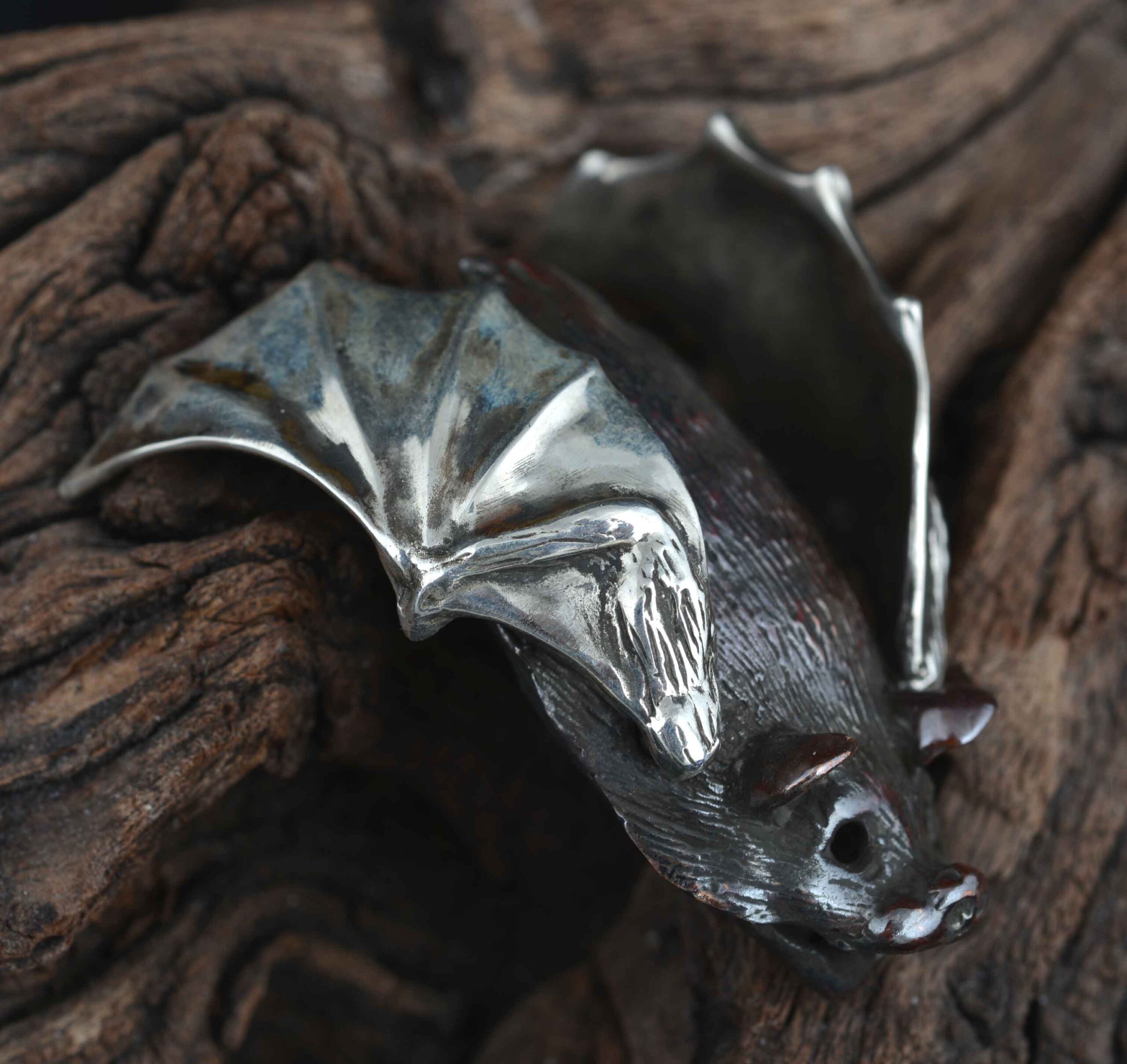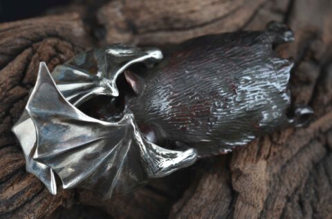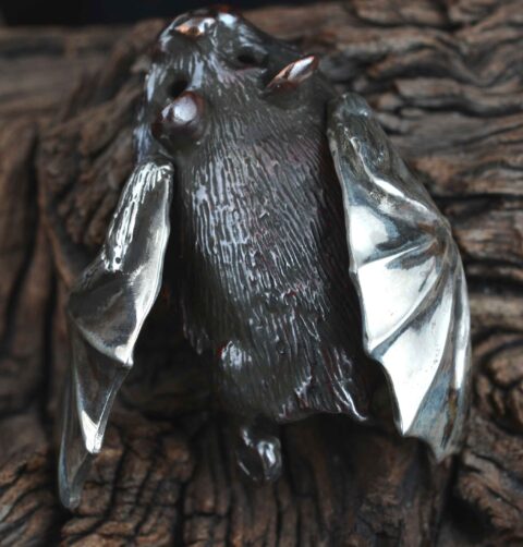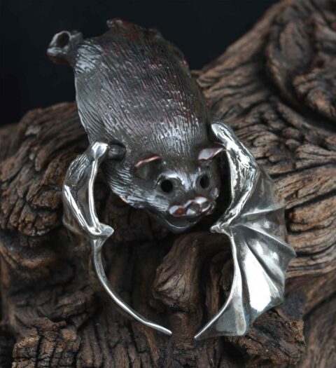 These sweet bats are hard to find, and we have difficulty keeping them in stock. Each one is a wearable kinetic sculpture measuring 1 1/2″. The wings pivot around and hang down as if the bat is ready to drop from its roost.